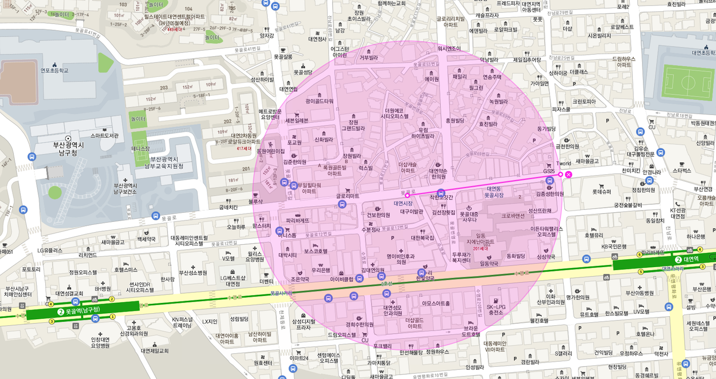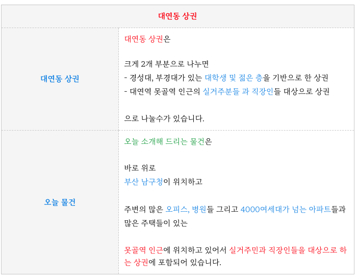부산 남구청이 위치해 있어서 실거주 환경의 상권들과 직장인들을 위한 상가들이 많이 분포되어 있습니다.