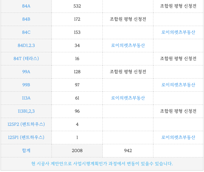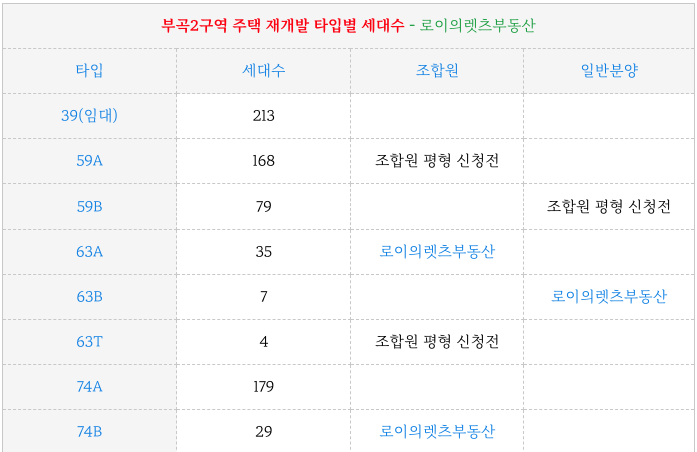 부곡2구역 재개발의 GS건설이 제안안 각 타입별 세대수 입니다.