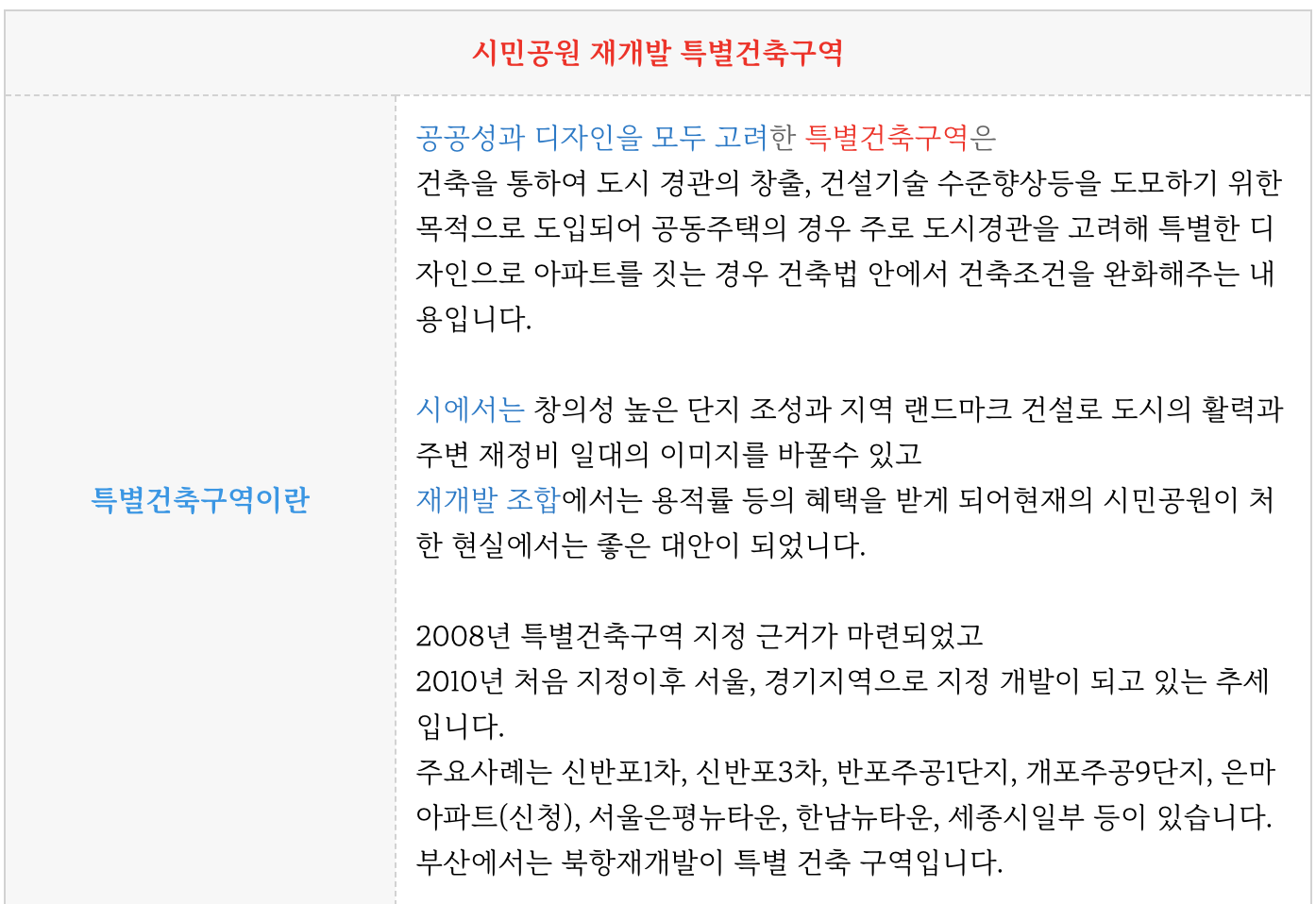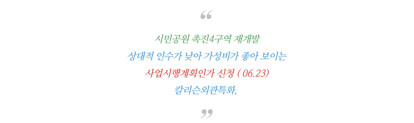 시민공원 촉진4구역을 포함한 시민공원 주변 재개발의 특징 을 다시 한번 간략히 정리해 드립니다.