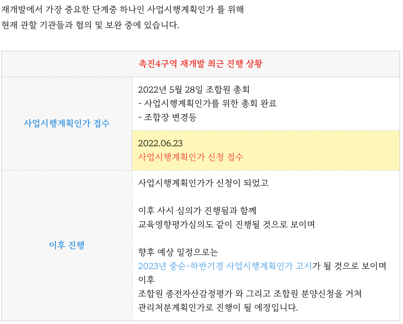시민공원 촉진4구역 재개발의 현재까지의 진행 상황 정리 및 타입별 세대수는 아래 페이지를 참고 부탁드립니다.
