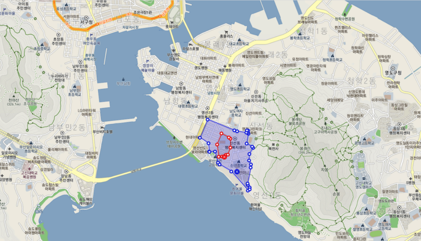 영도5구역을 가로지르는 도로와 남항초와 대원아파트를 기준으로 2개 블록으로 나뉘어져 있는데