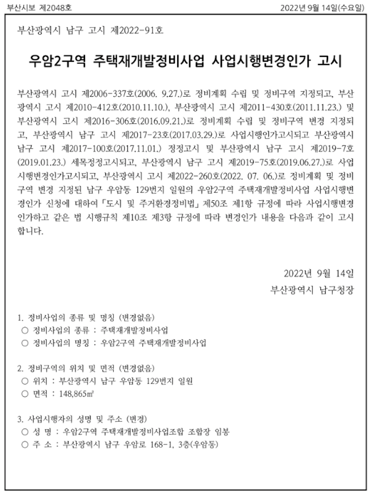 우암2구역 재개발은 사업시행계획인가 변경에 이어 관리처분계획인가 변경까지 고시 되었습니다.