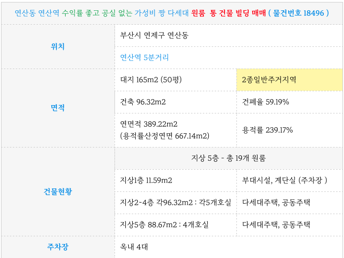 연산동 수익률 최고 다세대 원룸 통 건물 매매 ( 룸 19개, 매매가 9억 )