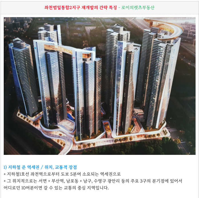 좌천범일통합2지구 재개발의 주요 특징들입니다.