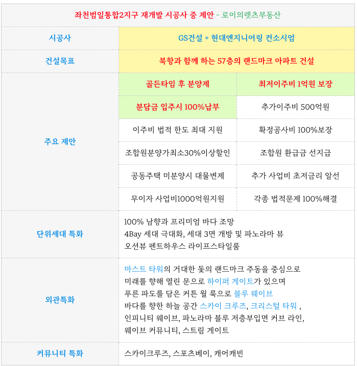 - 외관특화와 골든타임 후 분양제 , 최저이주비 1억원 보장, 분담금 입주시 100%납부 등