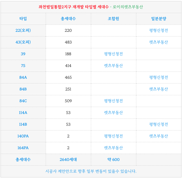 좌천범일통합2지구 재개발의 타입별 세대수 입니다.