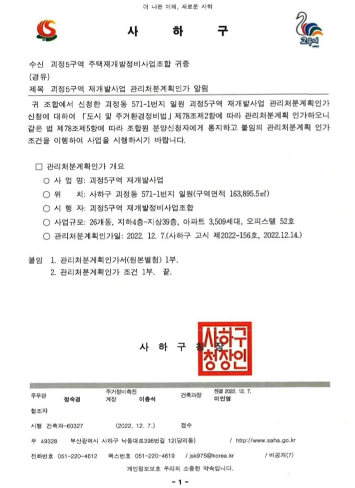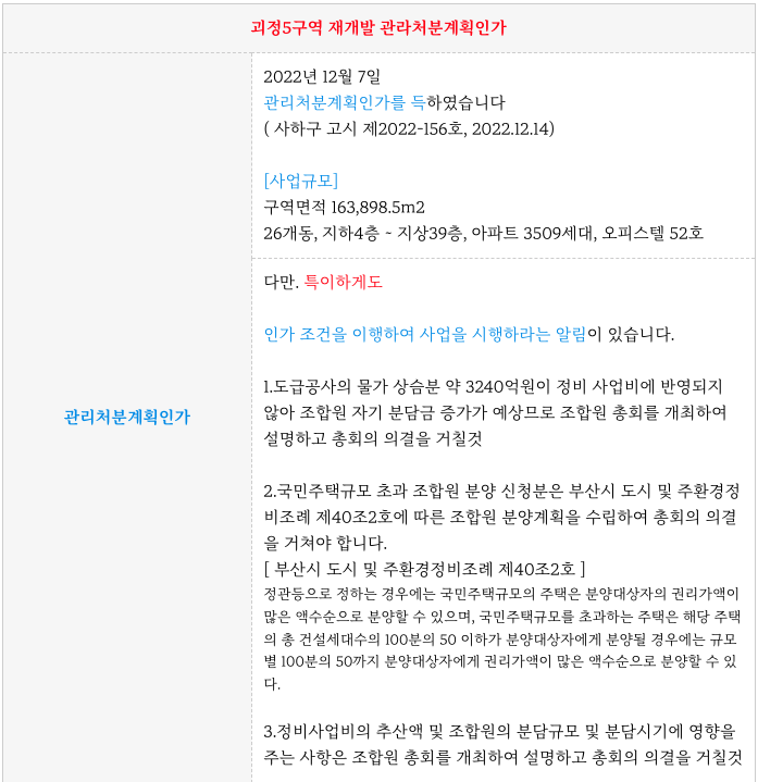 괴정5구역 재개발은 12월 7일 관리처분계획인가를 득하였습니다.