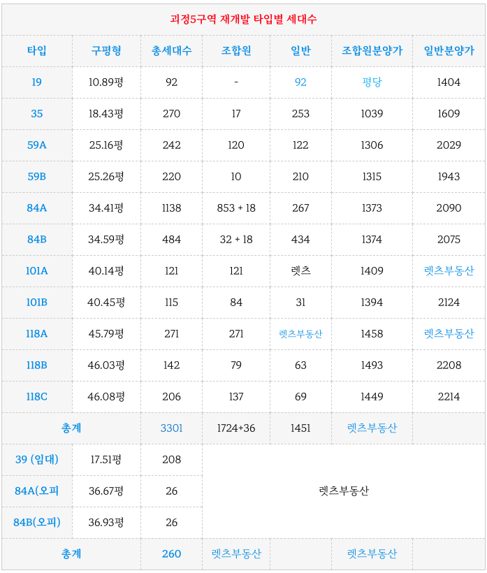 괴정5구역 재개발의 각 타입별 조합원 분양가와 세대수 입니다.