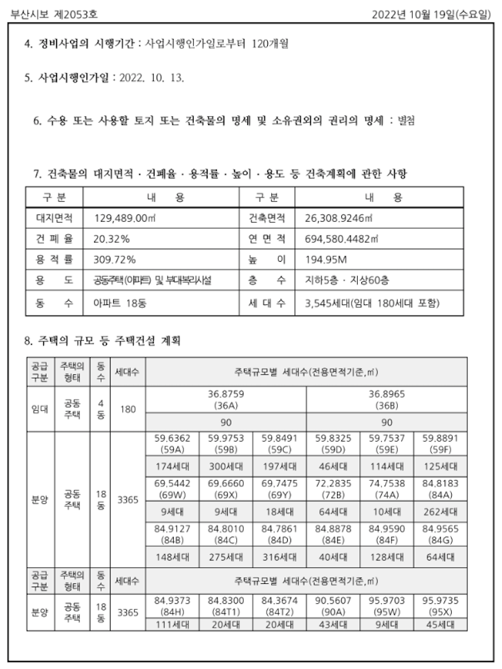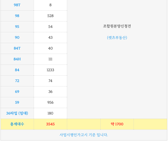 아래 수치는 사업시행계획인가 고시상의 타입별 세대수 입니다.