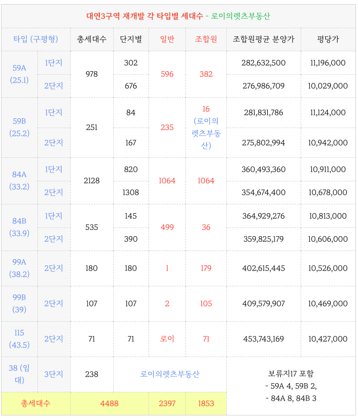 대연3구역 재개발 각 타입별 세대수, 조분가 등 입니다.