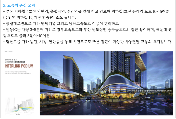 인근에 동래구청 과 재래시장인 동래시장과 대형마트 역시 바로 인접해 있어 실거주 환경이 편리 하며