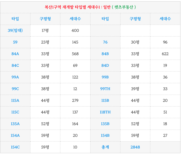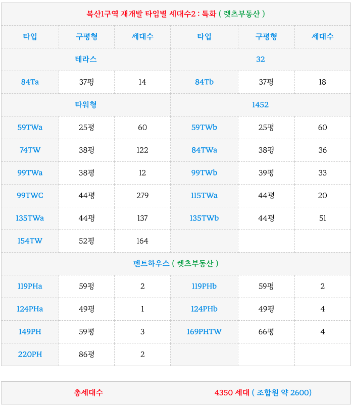 동래구 복산1구역 재개발 의 금번 GS건설의 특화 설계 제안을 통한 각 타입별 세대수입니다.