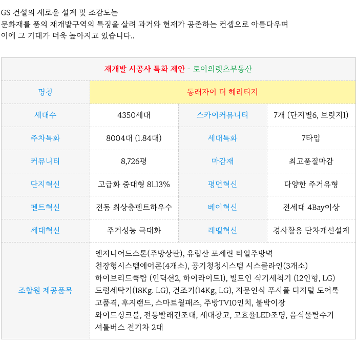 동래구 복산1구역 재개발 의 시공사의 새로운 고급화 / 특화 제안 내용 부분 입니다.
