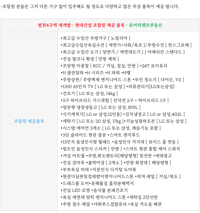 범천4구역 재개발 현대건설에 제안한 조합원 무상 제공 품목을 입니다.