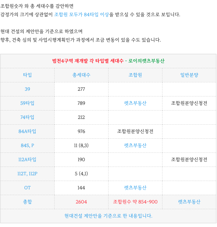 범천4구역 재개발 의 각 타입별 세대수 입니다.