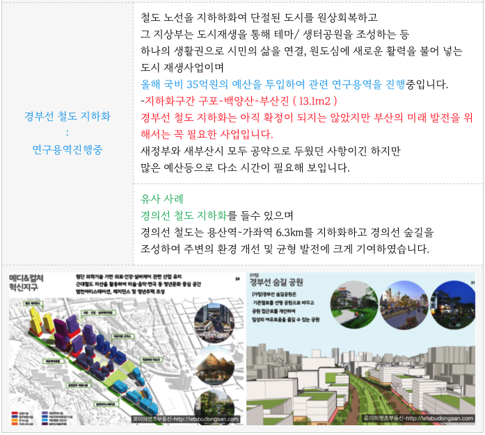 - 부산 경부선 철도 지하화는 부산시 중심 과제로 공약등으로 나왔지만 아직 확정 및 일정이 미정입니다..