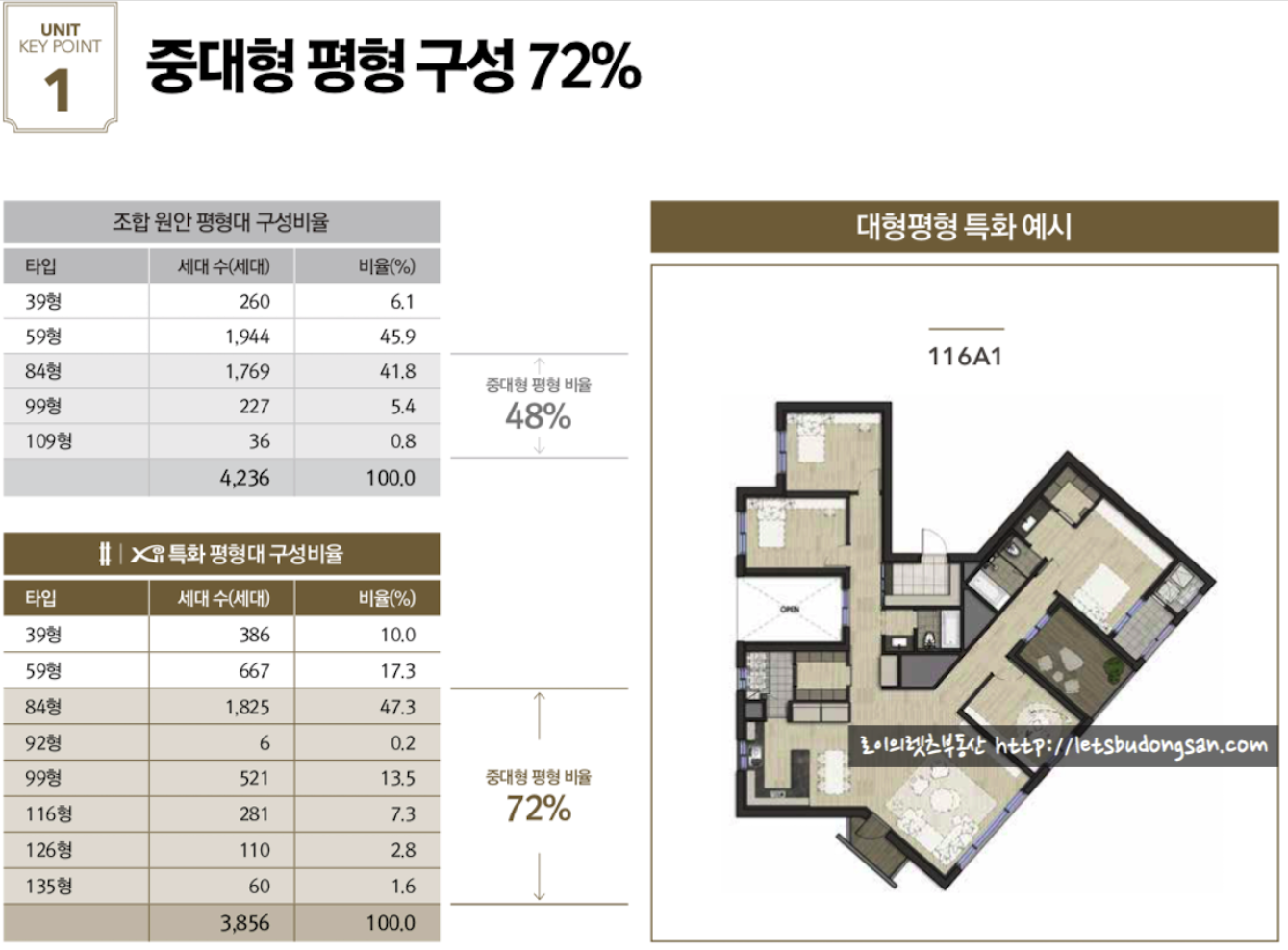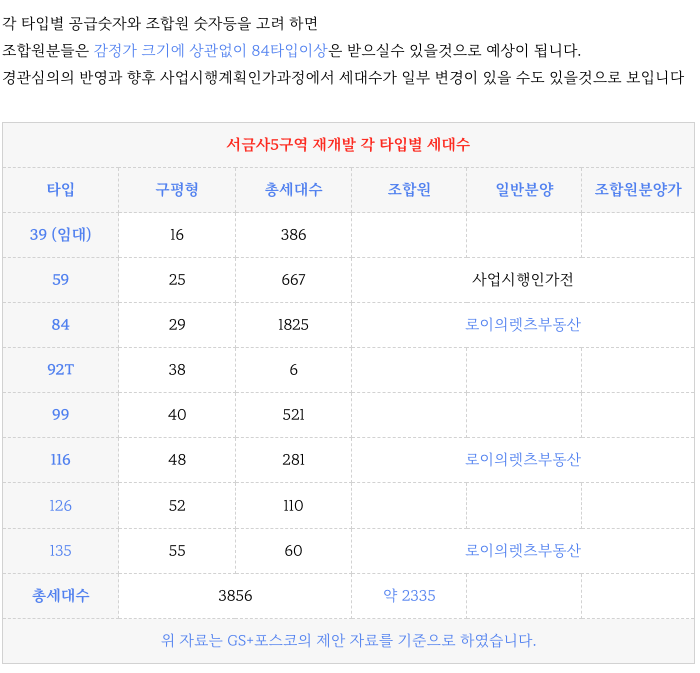 서금사5구역 재개발의 시공사에서 제안한 각 타입 세대수 입니다.