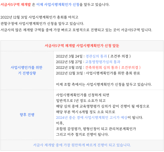 서금사5구역 재개발의 현재까지의 진행상황을 정리 등 추가정보는 아래 페이지를 참고 부탁드립니다.