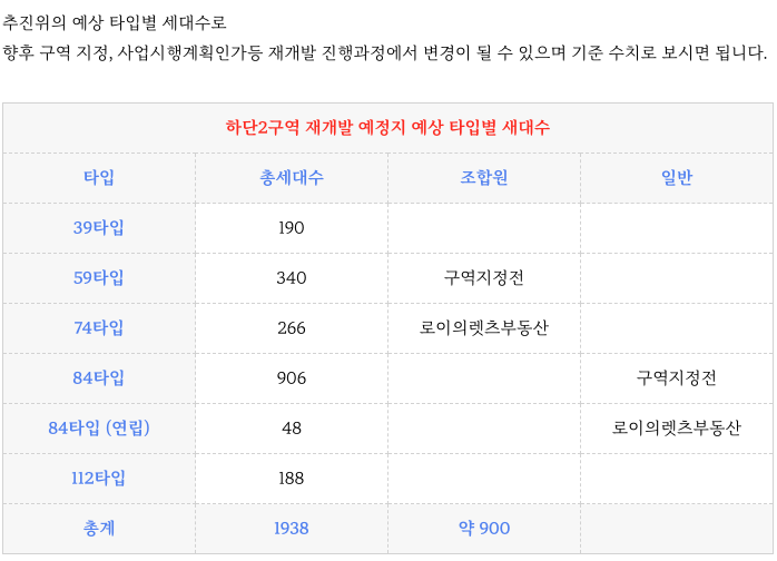 하단2구역 재개발 예정지 의 예상 타입별 세대수 입니다.
