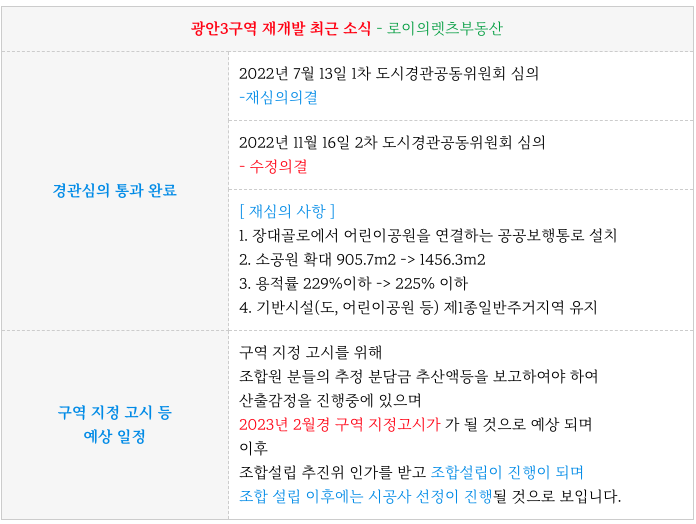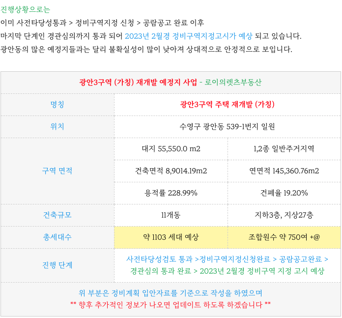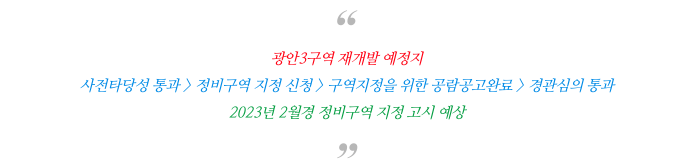 구정지정고시 앞둔 광안3구역 재개발 예정지 최근 진행 소식과 물건정보를 소개 드리겠습니다.