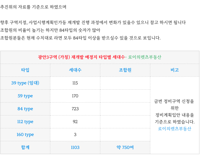 광안3구역 (가칭) 재개발 예정지 타입별 세대수는 아래와 같습니다.