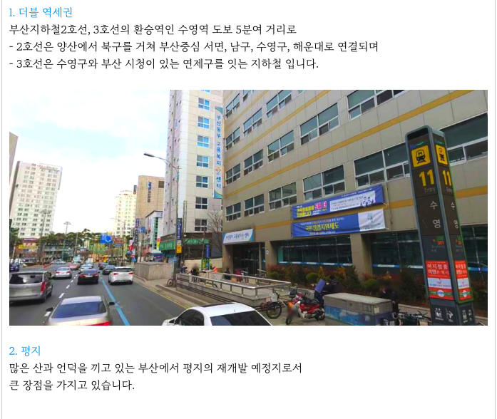 부산 지하철 2호선, 3호선의 환승센터인 수영역의 도보 3분여 더블 역세권 이며