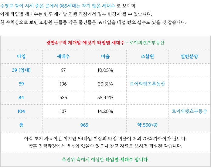 광안4구역 재개발 예정지의 추진위 예상 타입별 세대수 입니다.