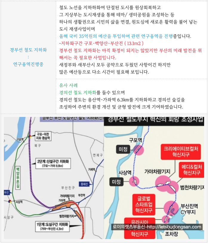 - 부산 경부선 철도 지하화는 부산시 중심 과제로 공약등으로 나왔지만 아직 확정 및 일정이 미정입니다..