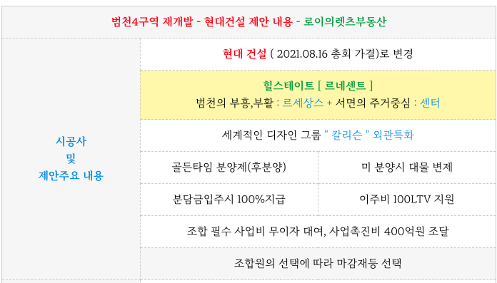 범천4구역 재개발 현대건설에 제안한 주요 제안 내용과 조합원 제공 품목을 입니다.