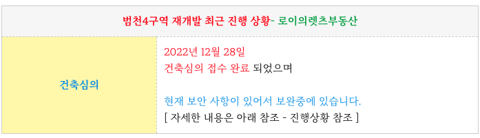 관할 구청에서 요청된 부분에 대해 협의 보완중에 있고 2023년 중순경까지는 통과를 기대하고 있습니다.