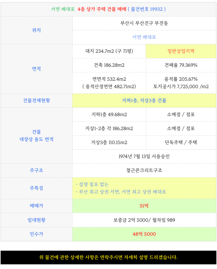 부산 최고 상권 서면 배대포 4층 상가 주택 건물 매매 물건 정보 정리 드립니다.