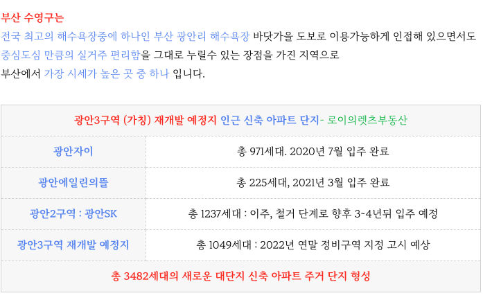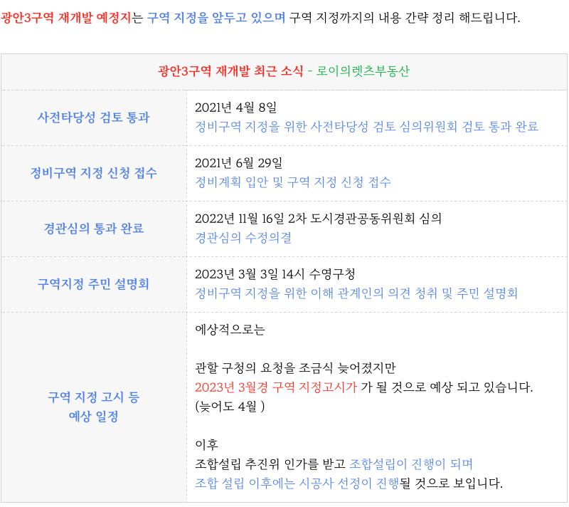 광안3구역 재개발을 비롯한 광안동의 주변 상황을 정리해 드리겠습니다.