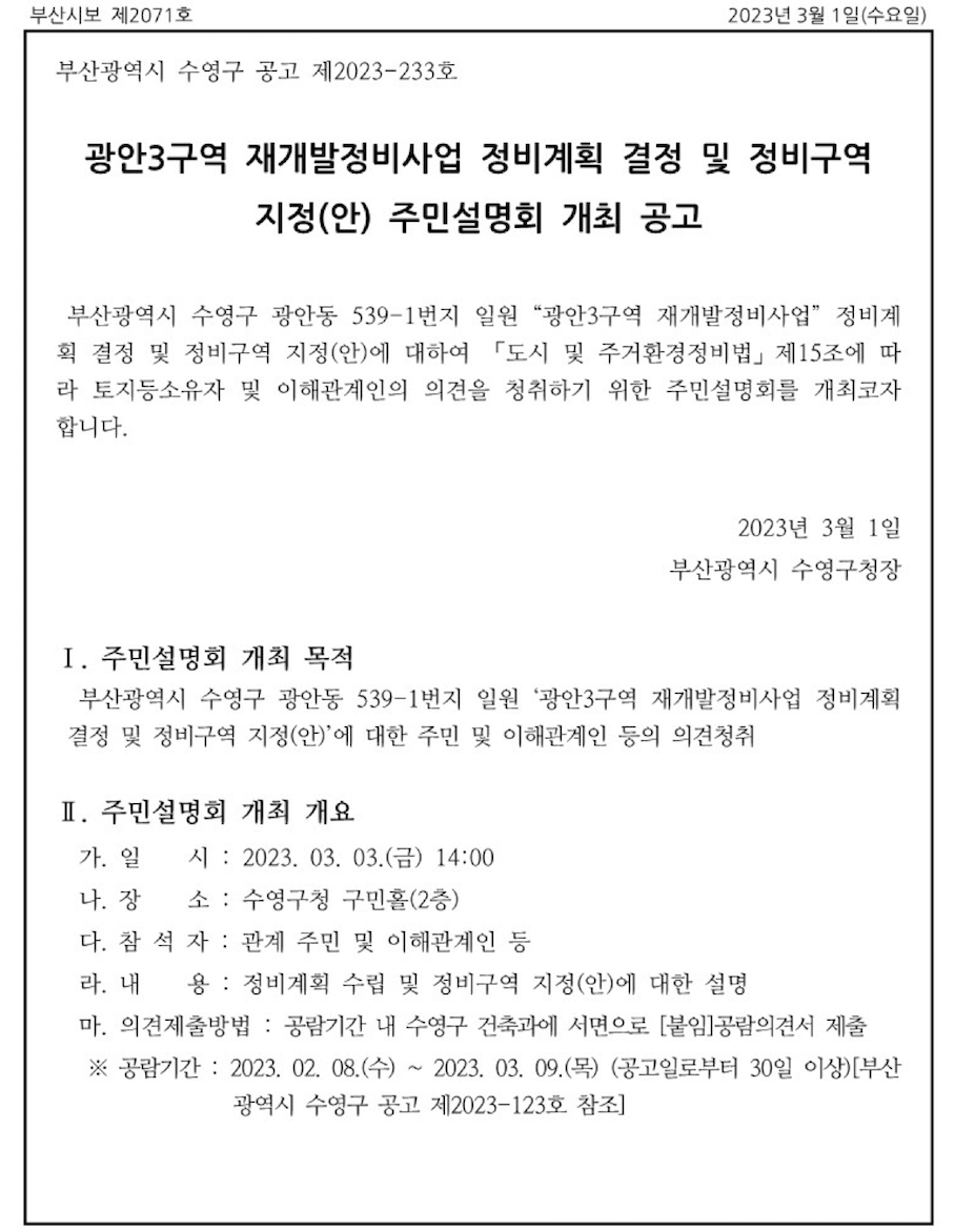 광안3구역 재개발 예정지 구역지정 설명회 소식과 시장 최저 매물 정보를 소개 드리겠습니다.