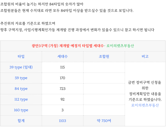 광안3구역 (가칭) 재개발 예정지 타입별 세대수는 아래와 같습니다.
