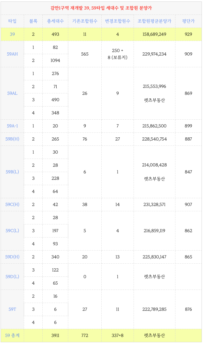 감만1구역 재개발의 각 타입별 세대수 및 조합원 분양가 입니다.