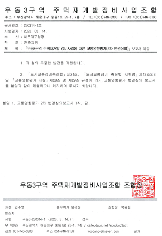 현재는 교통영향평가 심의를 위한 보고서를 관할 구청에 제출 하였습니다.