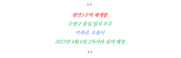 광안5구역 재개발 예정지에 관심이 있으신 분들은 연락주시면 자세히 설명 드리겠습니다.