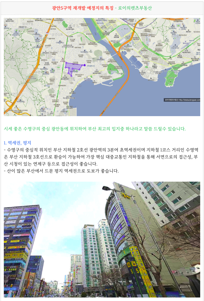 광안5구역 재개발 예정지의 특징 들을 간략히 정리하였습니다.