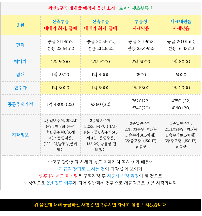 광안5구역 재개발 예정지의 인수가 최저 물건 들을 먼저 소개해 드리겠습니다.