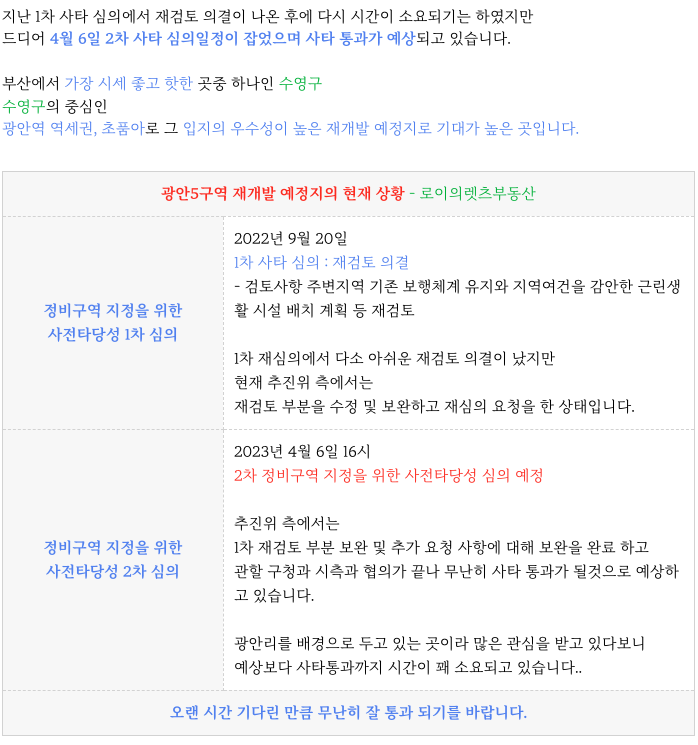 광안5구역 재개발의 현재까지의 초기 진행상황 정리등 추가 정보는 아래 페이지를 참고 부탁드립니다.