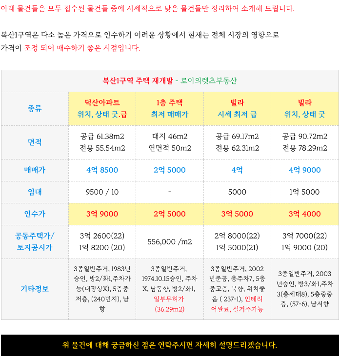 복산1구역 재개발 가격 조정된 덕산아파트, 빌라, 주택 매물