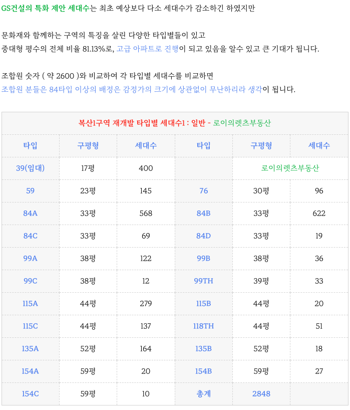 동래구 복산1구역 재개발 GS건설의 특화 제안 각 타입별 세대수입니다.