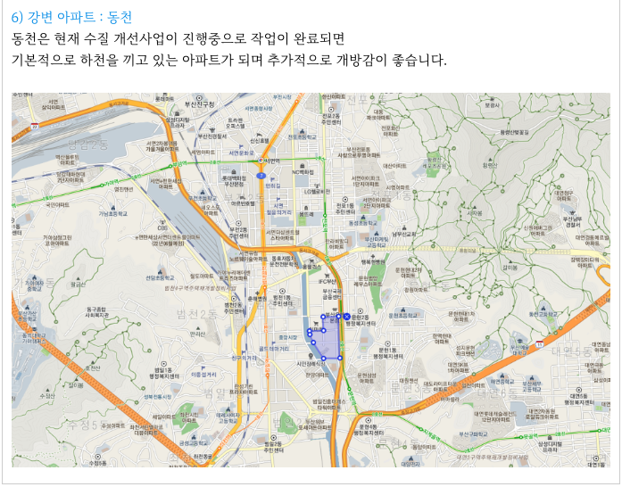 바로 옆으로 동천을 끼고 있어 개방감 역시 대단히 좋으며 강변 아파트의 혜택이 있습니다.