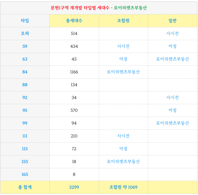 문현1구역 재개발의 타입별 세대수 입니다.