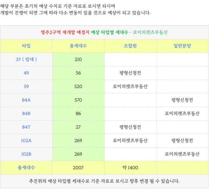 영주2구역 재개발 예정지 추진위 추정 예상 타입별 세대수 입니다.