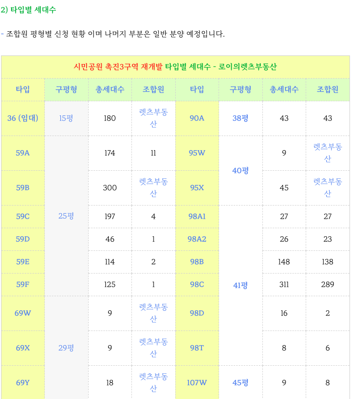 시민공원 촉진3구역 재개발 의 각 타입별 세대수 및 특징입니다.