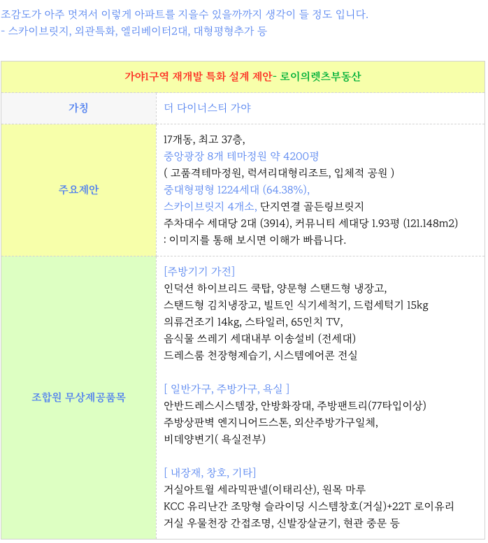 가야1구역 재개발 의 시공사에서 제안한 부분 SMDP외관특화 고급화 등 간략한 내용 입니다.