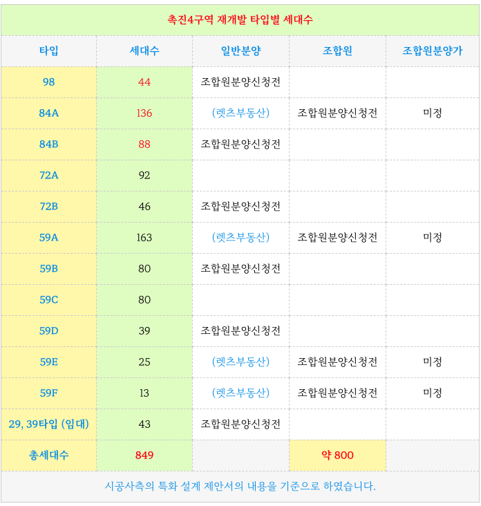 시민공원 촉진4구역 재개발의 각 타입별 세대수 입니다.