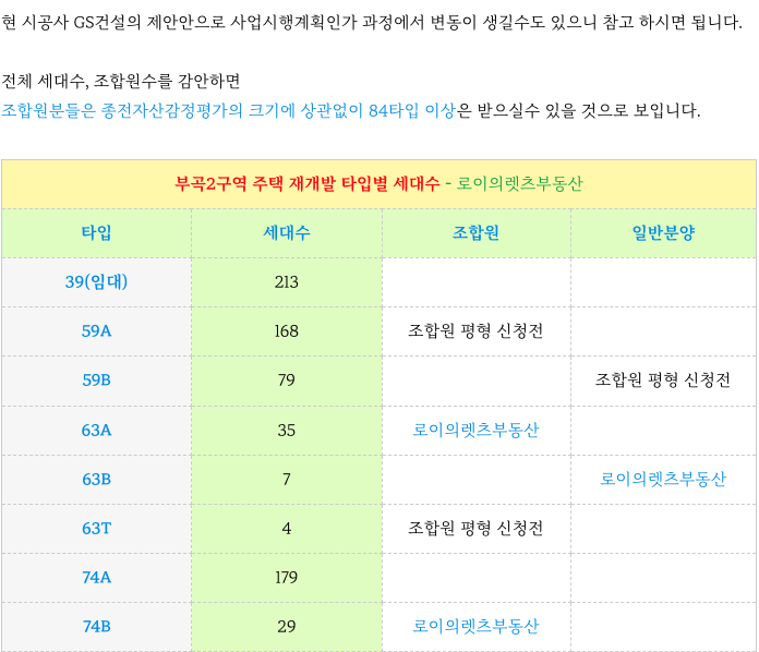 부곡2구역 재개발의 타입별 세대수 입니다.