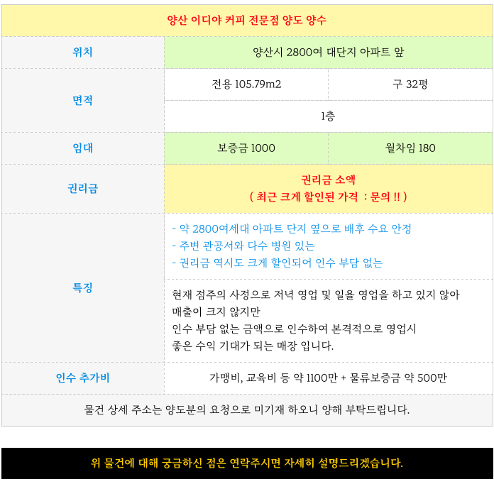 - 권리금 역시도 크게 할인되어 인수 부담 없는